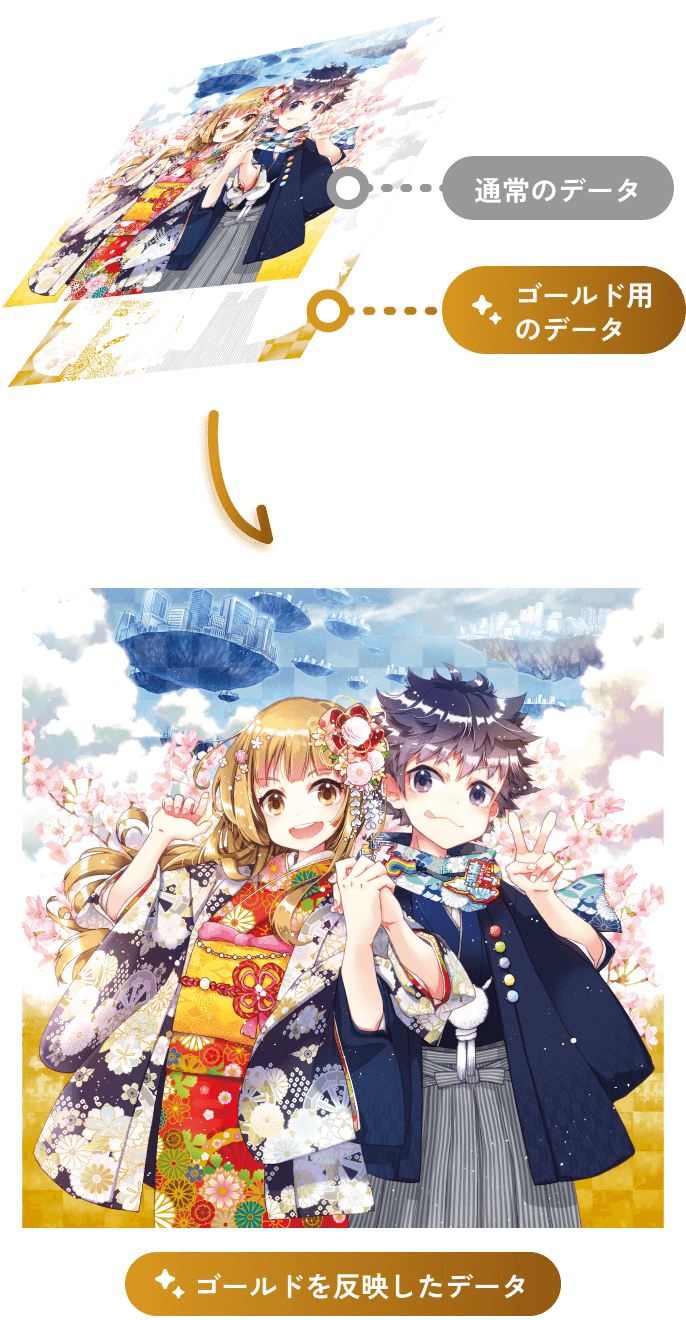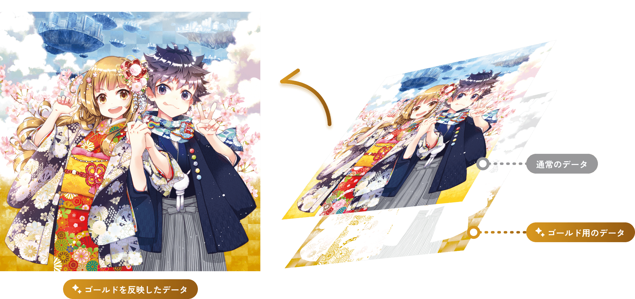 CMYKでは表現できない、繊細な輝きを印刷で実現。特殊色ゴールドトナーが、光に反射する美しい煌めきを紙に宿らせます。角度を変えるたびに表情を変える、まるで生きているような輝きです。