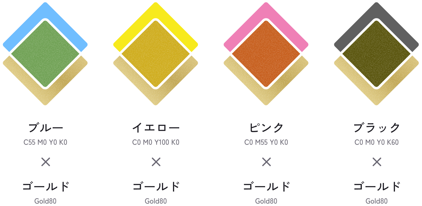 ピンクに重ねてピンクゴールド、グリーンに重ねてグリーンゴールドなど、 既存の色と組み合わせることで新しい色彩表現が生まれます。