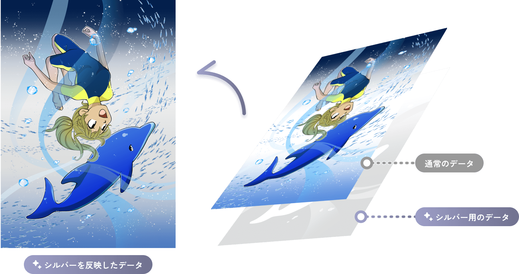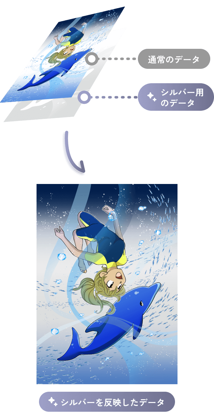 演出部分にシルバーを重ねることで、本物の光のような輝きを演出。星のきらめき、水面の反射、金属の光沢など、光の表現がより豊かで立体的になります。